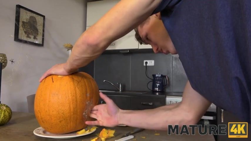 Pumpkin carving goes wrong and she sucks his cock